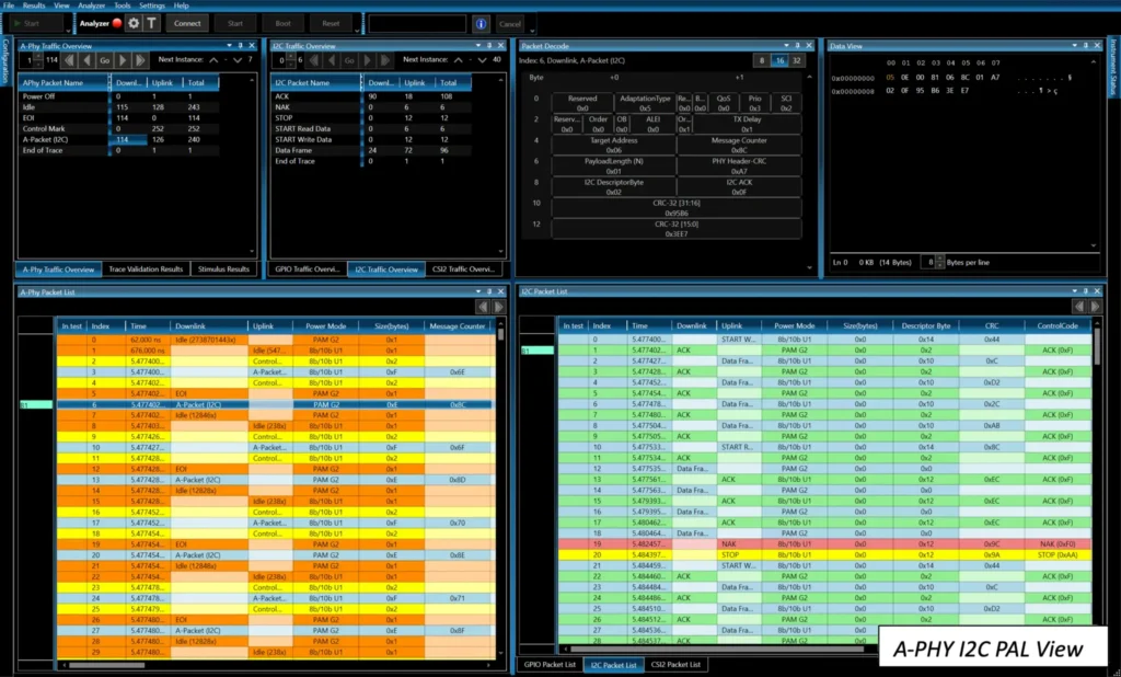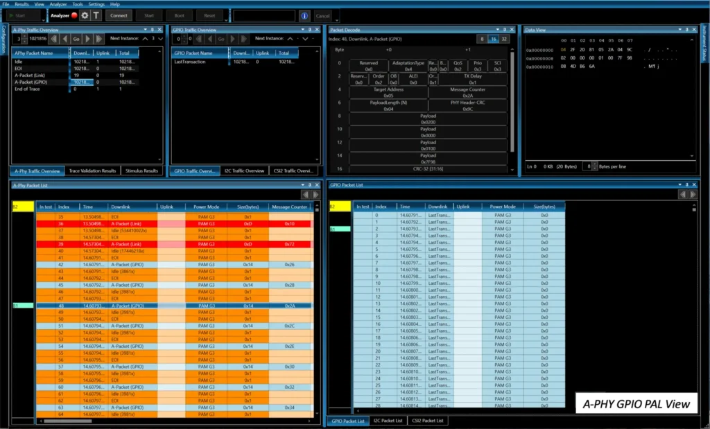 The Marlin A200 analyzer has industry leading features, providing time correlated packets of uplink and downlink traffic, and packet statistics. The A200 analyzer displays a time-correlated decode of A-PHY packets and PAL data: CSI2, I2C, and GPIO. The Marlin A200 seamlessly integrates with the Protocol Insight® software, with valuable tools including: CSI image Viewer, Trace Validation™ and the Stimulus Test Editor™. The CSI Image Viewer provides real-time CSI2 packet information, including display of captured images and their corresponding frames. The Marlin exerciser, available next year, supports traffic generation with error injection, enabling sink or source emulation and CTS compliance verification. The Stimulus Test Editor™ allows users to create custom A-PHY traffic patterns and define complex Advanced Trigger conditions. Trace Validation™ can be used to evaluate the received traffic, perform latency analysis and define configurable pass / fail criteria.